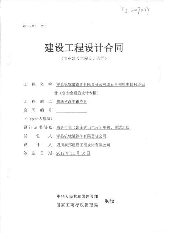 洋縣釩鈦磁鐵礦有限責(zé)任公司廢石再利用項(xiàng)目初步設(shè)計(jì)(含安全設(shè)施設(shè)計(jì)專篇)